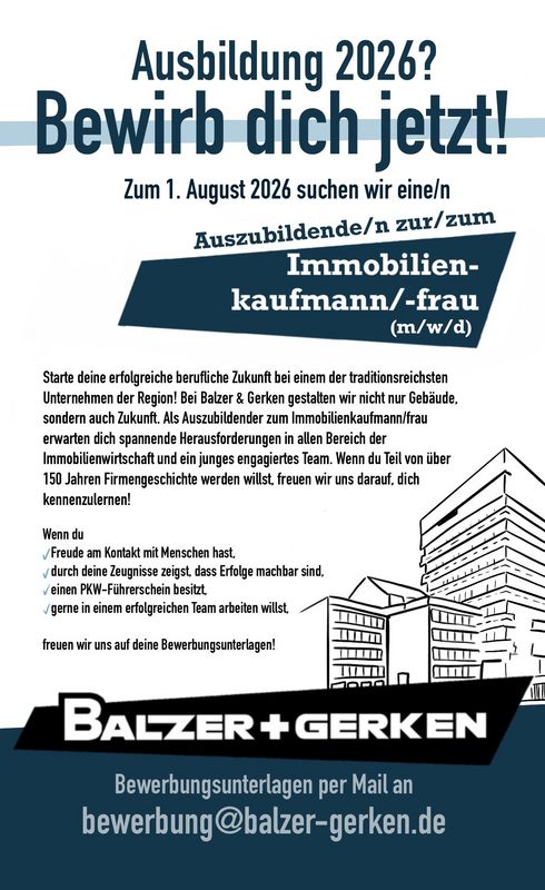 Über einen Zeitraum von drei Jahren wird Tim Gottschalk intensiv zum Immobilienkaufmann ausgebildet werden. Wir sehen mit Vorfreude dem kommenden Arbeitsverhältnis entgegen und möchten ihn herzlich in unserem Unternehmen willkommen heißen.